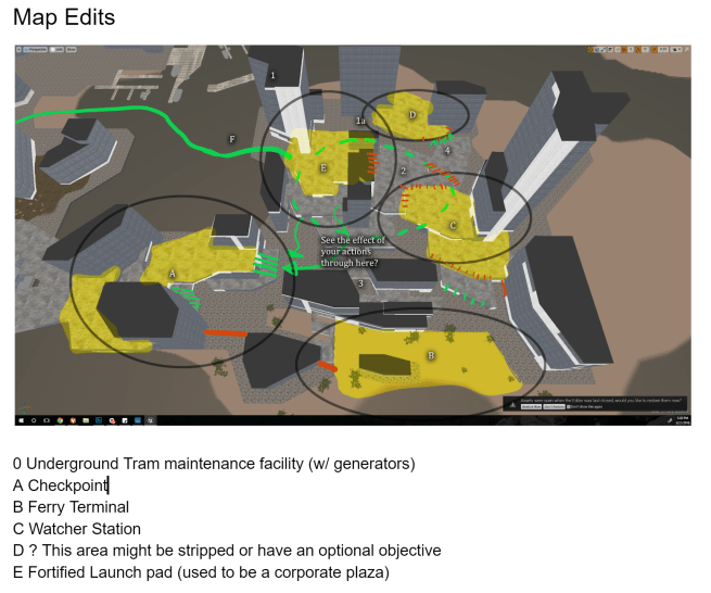 - Final Layout as seen from above was close in shape but wildly different in playthrough. During this phase I was fine tuning sightlines and gameplay. Alos ensuring level artitst weren’t covering up important gameplay objects or pathways.