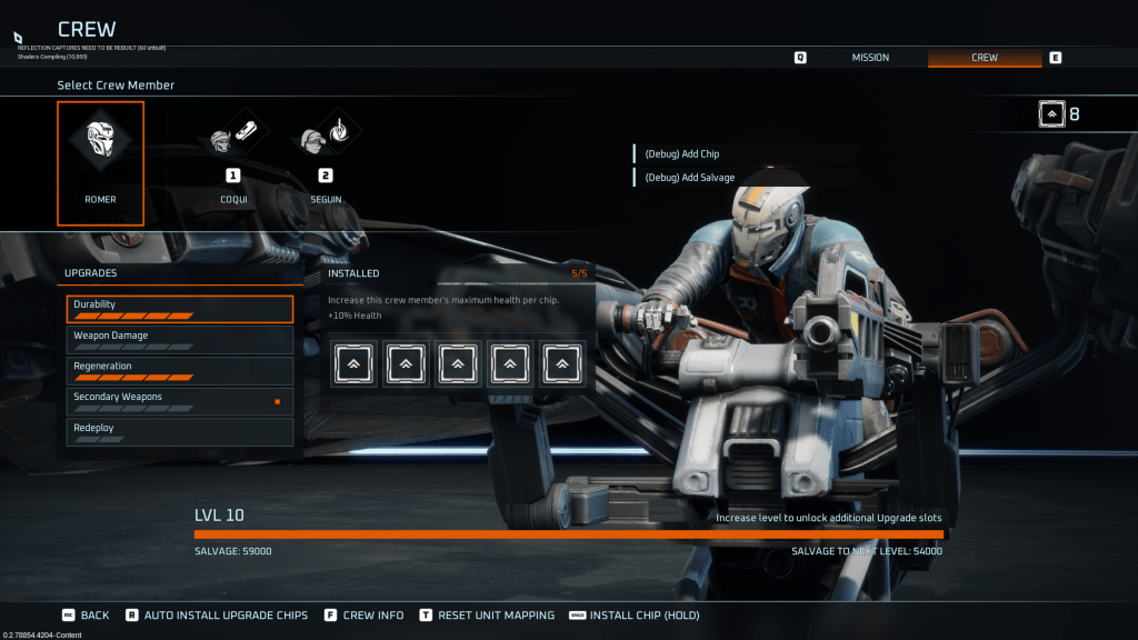 - Players find salvage and a finite number of rare “upgrade chips” through out the game