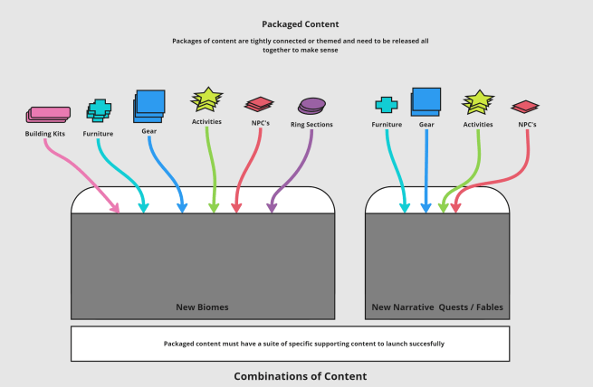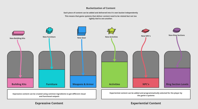 In order to be a live service game over a number of years we must build our game so that it can grow, evolve, and be added to on a regular cadence. That means where possible our strategy will be to utilize siloed content “buckets”.
