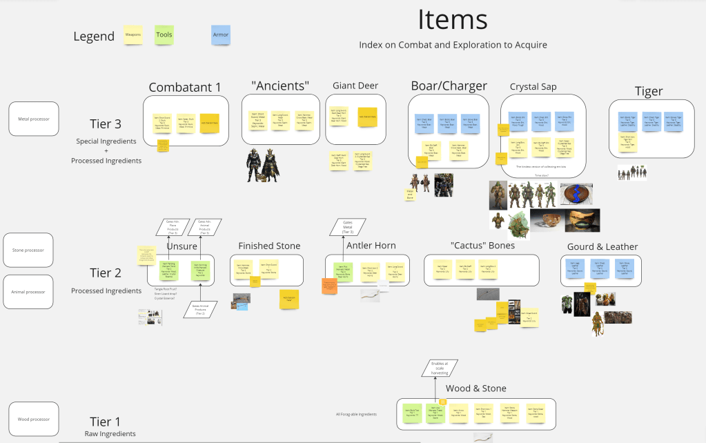 - Game economy including resource generation and how materials related to craftable items